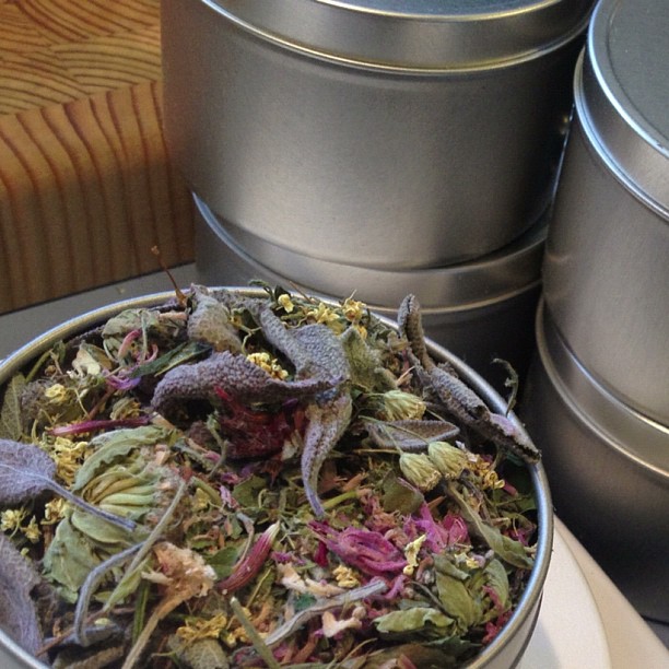 Need an energy boost? Go with an aromatic herbal blend.  Rose, Mints, Lavender, Lemon Balm — all have aromatic oils that are uplifting and can provide a boost of energy without adding the extra stress on the system that caffeine offers. These herbs can help clear a foggy head in the middle of a workday, break up tension from stress or soothe a headache caused by dramatic changes in the weather patterns.